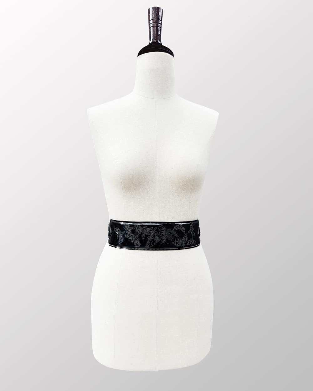KAO is an high waisted belt in black patent leather, engraved with the moth Sphinx, embleme of Dea Cult.